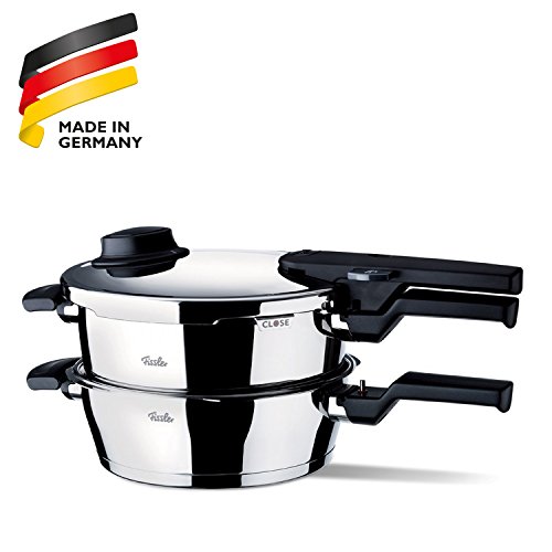 Un ottimo set di pentole marcato Fissler, sinonimo di garanzia e di ottima fattura. Le tecnologie impiegate per queste due pentole consentono di cucinare in maniera sicura e veloce su tutti i tipi di piano cottura. Anche se si è inesperti, con l’indicatore di cottura a semaforo (posto sul manico) non si può sbagliare. L’ottima chiusura facilitata, inoltre, permette di cucinare in tutta sicurezza, mantenendo elevata la pressione interna e senza disperdere inutilmente vapore.